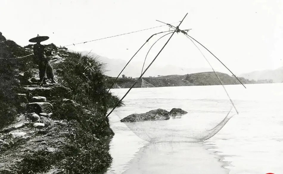 图里的大口网叫扳缯,四根长篙扎成个骨架,细绳拴在岸上,等鱼群从网口上头擦过去,岸上人猛一扯,咔哒一声竹篙合拢,网肚鼓起来像抱了口水,扯网的人草帽压得很低,脚下石坎湿滑,手心被麻绳磨得生茧,爷爷说这法子讲究眼力,水色一变就得提,慢半拍就空了。