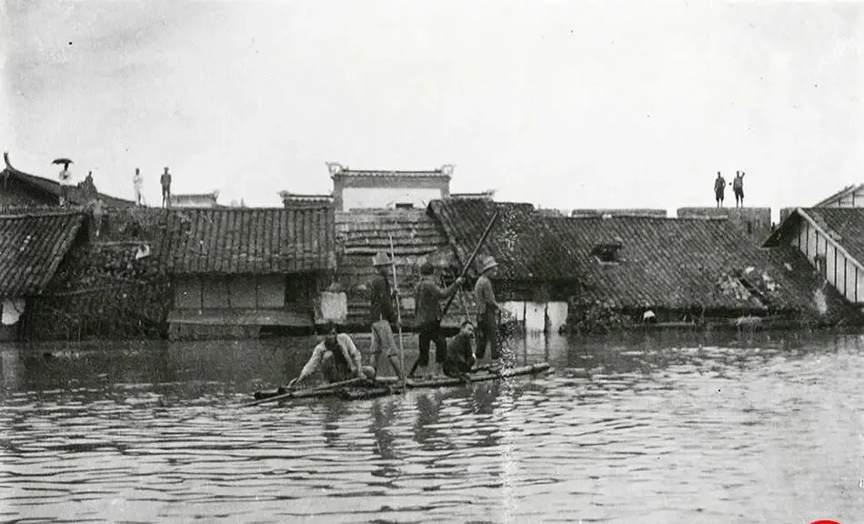 这个满眼都是水的场景叫水患,屋脊只露出一道黢黑的脊背,几个人撑着竹排在巷道上摸过去,门匾被水一冲就浮起来,贴在墙角晃,听老人说那年大水来得急,鸡犬往树上窜,人把米囤抱在怀里也挡不住水腥味冲鼻,现在河堤修高了,警报一响就能转移,当年就凭天吃饭。