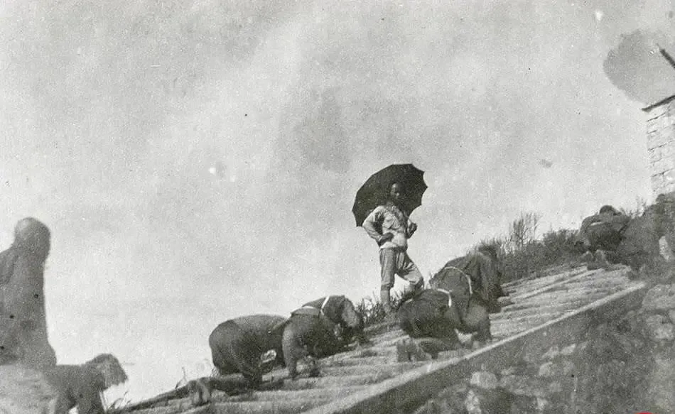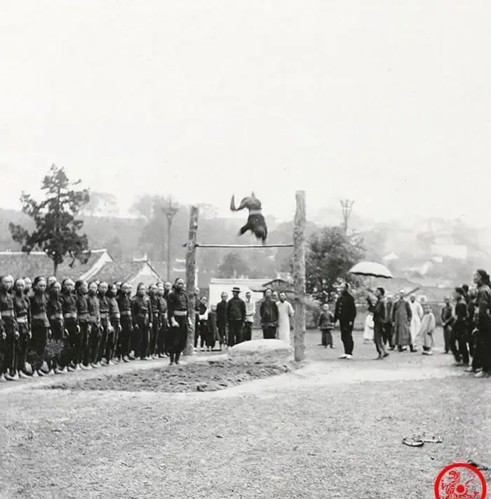 这个一溜儿站着的队列叫新军,脑袋上缠着布盔,腰带勒得直,横杠上那人翻过去,身子在半空团成个球,场边一位穿长袍的手里举着伞,伞面黑得发亮,教官喊口令的嗓子像铜钟,叔叔笑说这阵仗看着齐,真打起来还得看胆气,现在体育课里也有翻杠,鞋底却不再钉铁掌。
