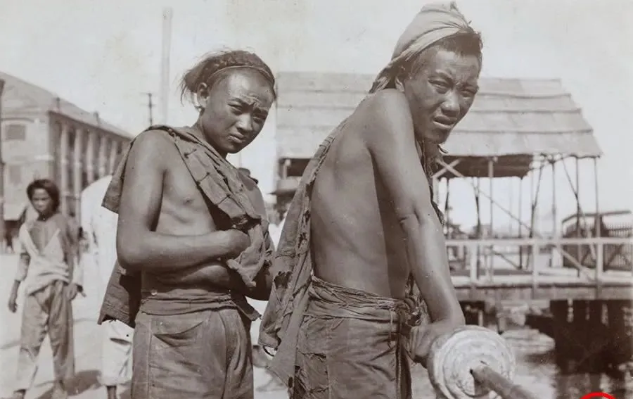 图中这对赤膊壮汉叫挑夫,也有人喊脚夫,手里攥着的粗麻绳勒着船缆,皮肉晒成了铁色,辫子不是缠脖子而是盘在头顶,缠脖子干活会勒得慌,脖颈一出汗就火辣辣的疼,挑夫懂门道,先把辫梢塞进布头里,再往腰间一束,脚下一使劲,木排就挪窝了,后来人都说那会儿朝廷默许剪辫子了,可真敢剪的没几个,饭碗要紧,规矩更要紧。