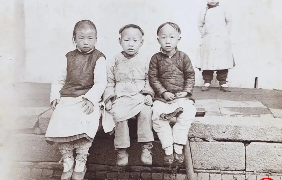 这个场景叫踅学前的空当,几个孩子坐在青石沿上,额前都剃得锃亮,等发梢够长了就要编辫子了,衣服绵绸里带补丁,鞋底厚得跟小船板似的,奶奶看见照片直嘀咕,说那时理个辫子也讲究匠心,梳油要抹匀,编时掺根细线防散开,现在的小孩跑两步就把发卡扯了,当年可不敢。