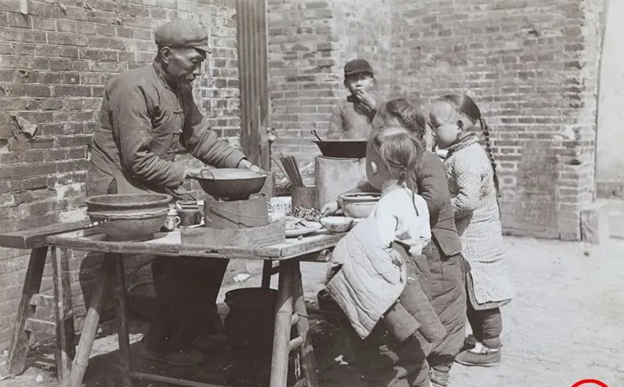 这张里头的是移动厨房,木架一搭,泥炉一坐,砂锅里咕嘟咕嘟翻着泡,孩子们踮着脚看,摊主手上飞快,瓢一转就把汤抖得均匀,碗边摆着葱花和辣末,妈妈笑说这阵仗像如今的流动餐车,不过那会儿多半是粗面糊糊和豆渣饼,香是香,顶饿才是正理。