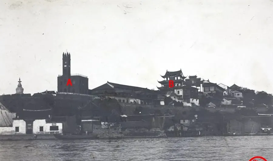 这个山头叫黄鹄矶,原有黄鹤楼的旧址在这带,照片里标了A和B两处新楼影,A是西式的高楼,窗子瘦长像教堂塔,B是重檐的中式楼阁,木梁挑着飞角,远远看去两种味道杵在一块儿,彼此都有些尴尬,外来的风格正往城里钻,旧的气脉还没散尽,这种并置感一看就懂那时局势的拧巴。