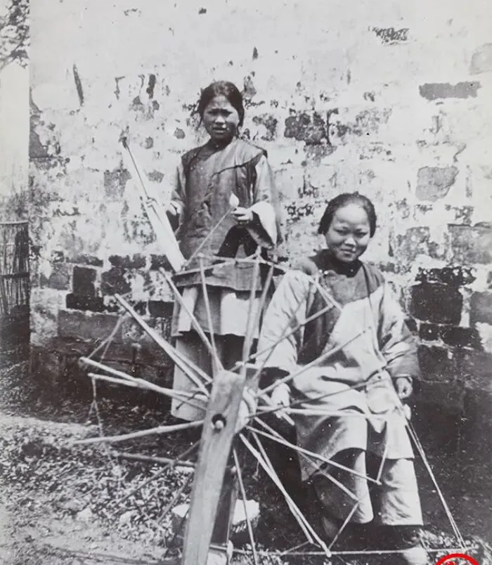 这个转得飞快的木轮叫纺车,女孩手上那个细长的是梭子,轮辐细密,木头是榆或槐,摸上去有温度,坐着的脚腕一蹬,车就“吱呀吱呀”转起来,线在指缝里抽丝般细,奶奶当年也这么干活,她说冬天手裂口子得抹猪油,线头粘到唇边一嘬,既稳妥又省力,现在买布几分钟,那时候织布要一季。