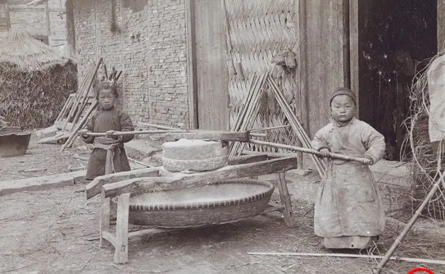 这对圆滚滚的家伙叫石磨,上磨带眼,下磨托面,木把横穿出去,两个小娃对着推,脚下踩着湿泥地,磨盘底下接着个大铜盆,米浆顺着磨齿慢慢淌,小时候我也帮着推过,手一松磨把会打回劲,可把手腕震得麻,奶奶总在旁边喊,小心点,磨齿咬手指可不是玩笑话,现在一台破壁机嗡一声就完事,那会儿磨一次能记住半天。