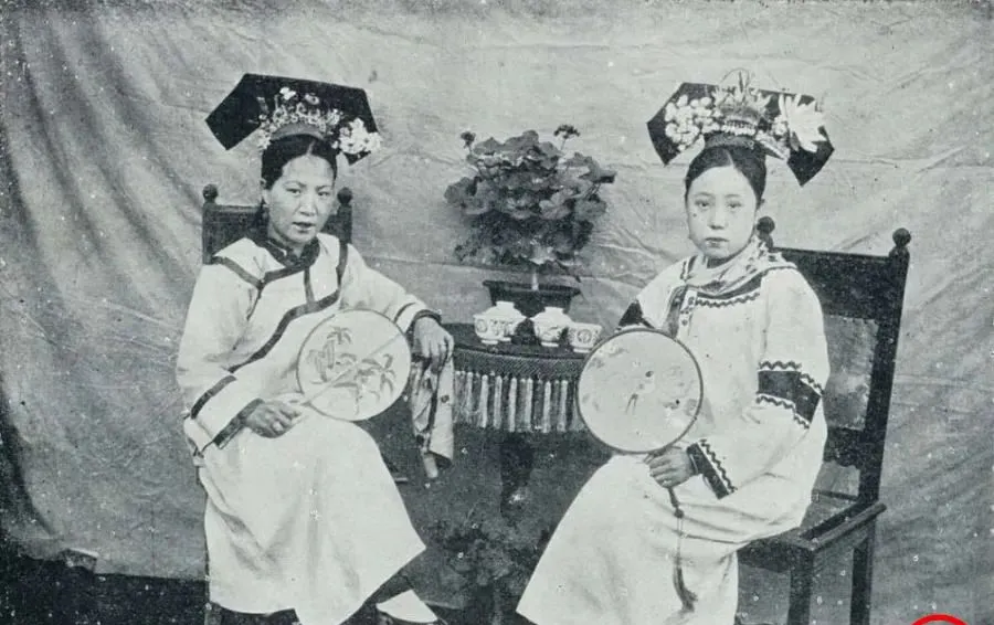 这两位的头面叫旗头,黑亮的硬翼往两边伸,发饰上插着花和珠,身上是绣边的旗袍,端坐在靠背椅上,团扇一翻露出细细的绢面,茶盏搁在小几上,姿态体面,可神气里透着倦,妈妈看了只说了一句,俸禄要紧的时候不难过,发不下来才难,一句话把八旗暮气点得明明白白。