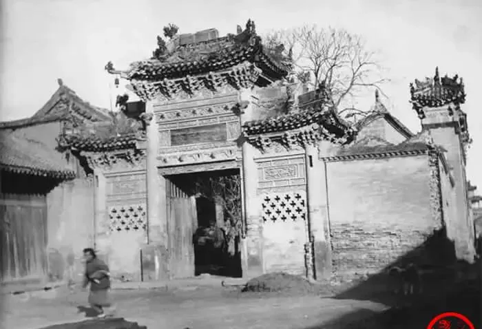 这个雕着卷草纹的门楼叫牌楼门,青砖底子,灰塑挑檐,门心嵌着匾额,四角立着小兽,外头一圈影壁挡直冲的气,里头院落深得很,男人们穿着长褂从门里闪一下就不见了,富贵人家讲排场,可门墩底下也是补丁补过的砖,刚刚经历大变,里子没跟上,面子还要撑着。