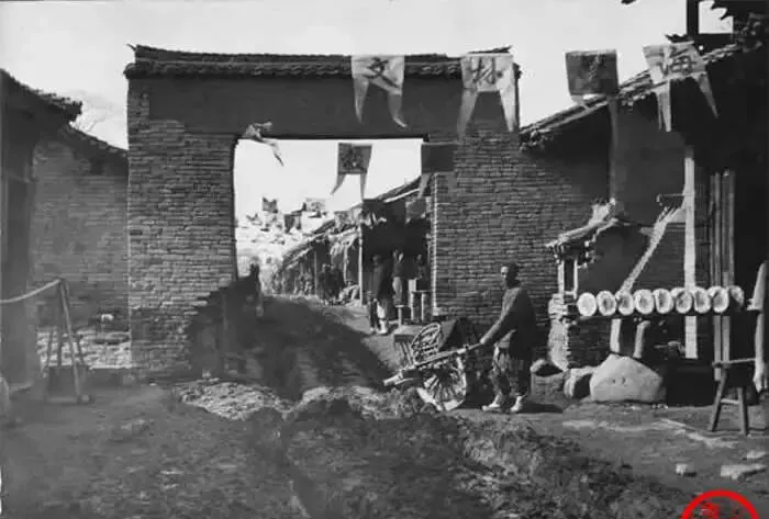 图里这道门叫券门,红砖起得紧,过了门就是一条集,地上水沟浅浅的,泥巴黏得要命,独轮车吱呀吱呀推进去,门楣上挂着旗子,写着“油”“面”的黑字被风掀着角,妈妈说以前集市一周一赶,现在手机点点就送到家,热闹的味儿却再也收不回来了。