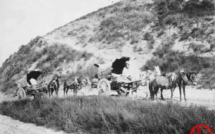 图中这串长车叫太平车,木轮子包着铁箍,辘辘一响能传一沟地远,车帷子用粗布搭的,风一灌就鼓成船篷,车把式戴斗笠,嘴里叼根草,手里甩着鞭子不太落下去,只在空中“啪”一声炸响,外公说跑这条道得会听坡声,上坡松缰,下坡死勒,要不人车一起滚沟里。