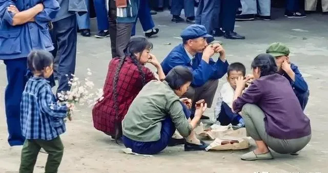 图中这摊位前蹲着的一家人,手里攥着窝头咸菜就开吃了,地上铺张纸就是餐桌,孩子抱着碗不吭声,大人们一边嚼一边盘算回程路费,那时候赶集讲究省字诀,能不花就不花。