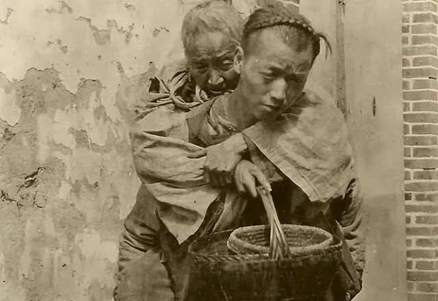 这个瘦汉子肩上挑担,一边是空碗一边是孩子,另一个小伙背着老父亲挨户求,妈妈说看见这样的人,心里发酸却也囊中羞涩,能给的就是一小撮米。