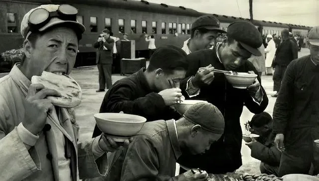 图里碗面饼子端着就吃,冒着热气,火车汽笛一响,碗往地上一搁,三口并两口下肚,那口面汤的咸味就是赶路人的底气。