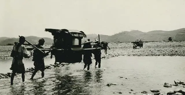 这个黑布盖着的叫篷轿,四个人分担着走,石子硌得脚底生疼,以前没有桥,就把肩膀当桥。