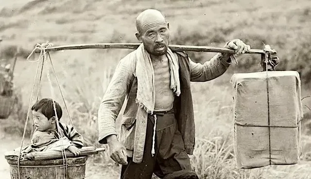 这位老汉肩挑双担,一头孩子一头油桶,步子慢却不肯歇,一边是孩子一边是家当,舍哪头都不成。