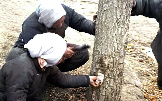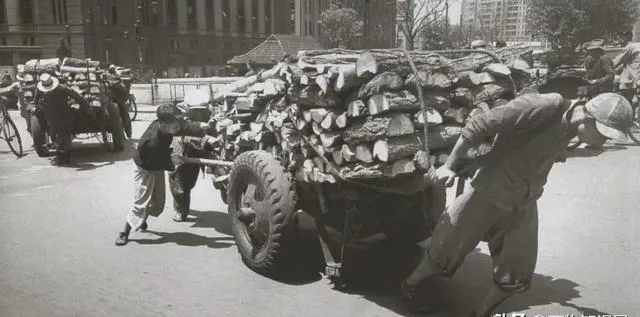 这手里钩子一勾就是树皮,装进口袋回去煮水糊嘴,街口的大车满载劈柴,前面人勒着肩带后面人顶着轮,能烧火做饭就有盼头。