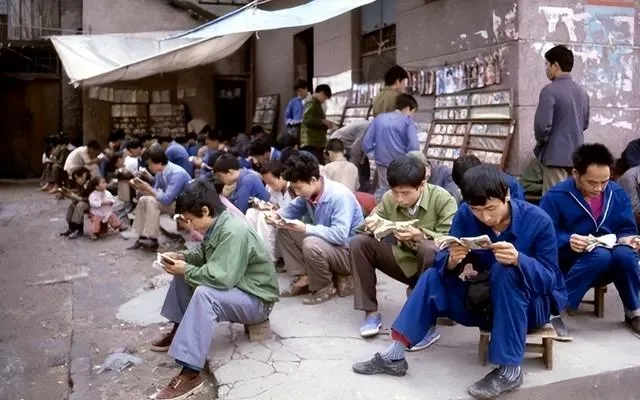 这排矮凳子上人挤人,手里攥着《白蛇传》《三国演义》,一角翻得起毛,桥头上几个年轻人站得高高的,说今天风儿顺,知识和风景都得抢着看。