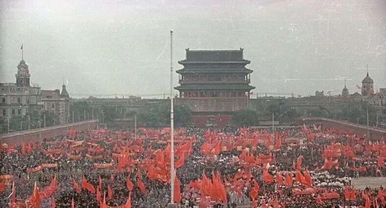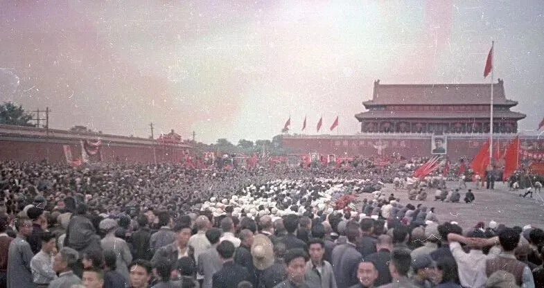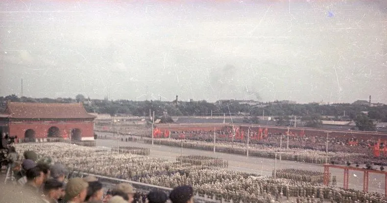 这个画面里有推车的、有牵着小孩的,棉袄褶子厚,裤腿口卷着灰,红旗像一堵墙从人背后刮过去,小孩踮着脚尖往前看,母亲握着他的手不松,外公说那天他就这样被大人拖着,在人缝里钻来钻去,鞋上全是土。