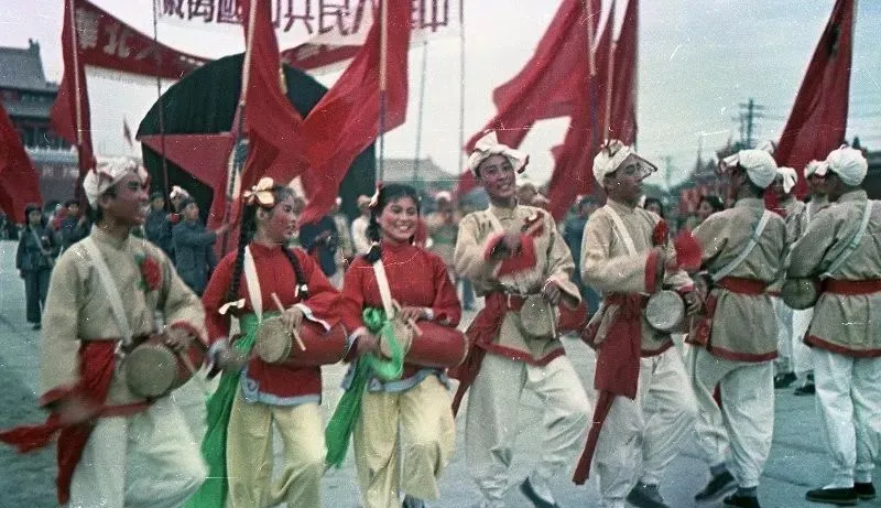 这个大红星是游行方阵的道具,木骨架上裱着红布,正中镶着肖像,星尖上吊着流苏,风一过就抖,锣鼓是实打实的铜面,一锤子下去声儿厚,穿锦沿的襟袄系上彩带,鼓手们脚下抬举步,腰一拧,鼓点就活了起来,妈妈笑过一句,说这身行头现在找也难找到了。