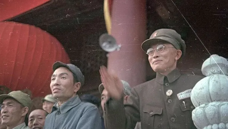 这位戴圆框眼镜,掌心往外一扬,像在应答下面的口号,军帽顶是一颗小星,扣子拉得紧,领口别着识别卡,石栏柱子的莲瓣纹路清楚,旁边的人抻着脖子看热闹,嘴角忍不住要跟着往上翘。
