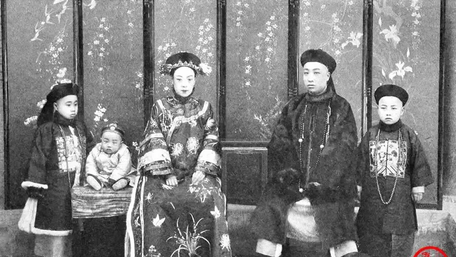 这张全家福里,穿着团花大袍坐在屏风前的是溥伦,身边的孩子穿吉样补子,胸口那块就是身份标记,左侧的小婴儿被高高垫起,像是特意让镜头看清楚,家里人站有站相坐有坐相,串珠朝服的线条一层一层,旧时人拍照少笑,不是冷,是觉得正经才体面。