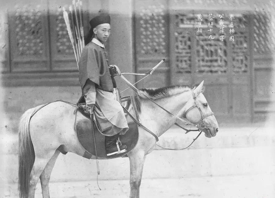这位骑在白马上的是载泽,背上斜插弓箭,马鞍前沿抹得锃亮,缰绳绕在指间不松不紧,靴筒压在马肚子两侧,少年脸削瘦,眼神却带着锋,宫里练骑射是真功课,不是摆拍用的道具,跑起来箭囊会拍在腰后,咯噔咯噔的声儿,现在听不到了。