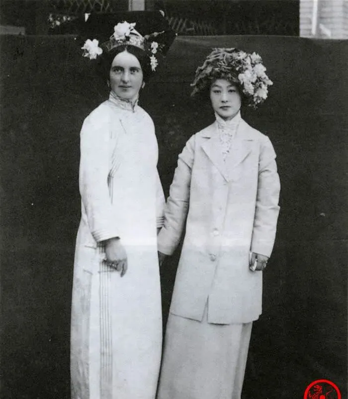 这个并肩牵手的是静荣和她的外国朋友,一身清新白色成了默契的配套,静荣戴花团似的头饰,外套却是西式剪裁,短翻领直溜溜落下去,手背相贴那一下挺自然,老辈常说闺门里哪有这么拍的,可泽公府那会儿开明,往来的人多,照片就有了这股新与旧掺着的味道。