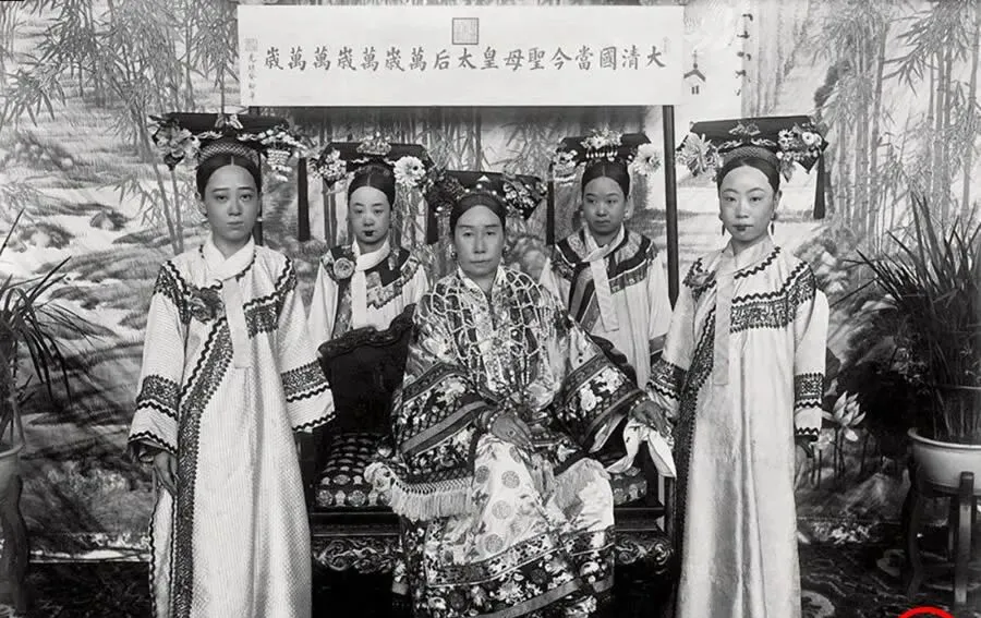 这张最热闹,中间正襟是慈禧太后,两侧站了四位格格和内眷,大家头上的大拉翅压满花朵与流苏,珠串横着绕过耳际,衣料是粗看素净细瞧繁复的织锦,台前摆盆景与竹石画轴,镜头里人人都沉得住气,宫里规矩多,笑也得含在嘴角里,不许露齿,拍完据说太后还得看底片,满意才准流传。