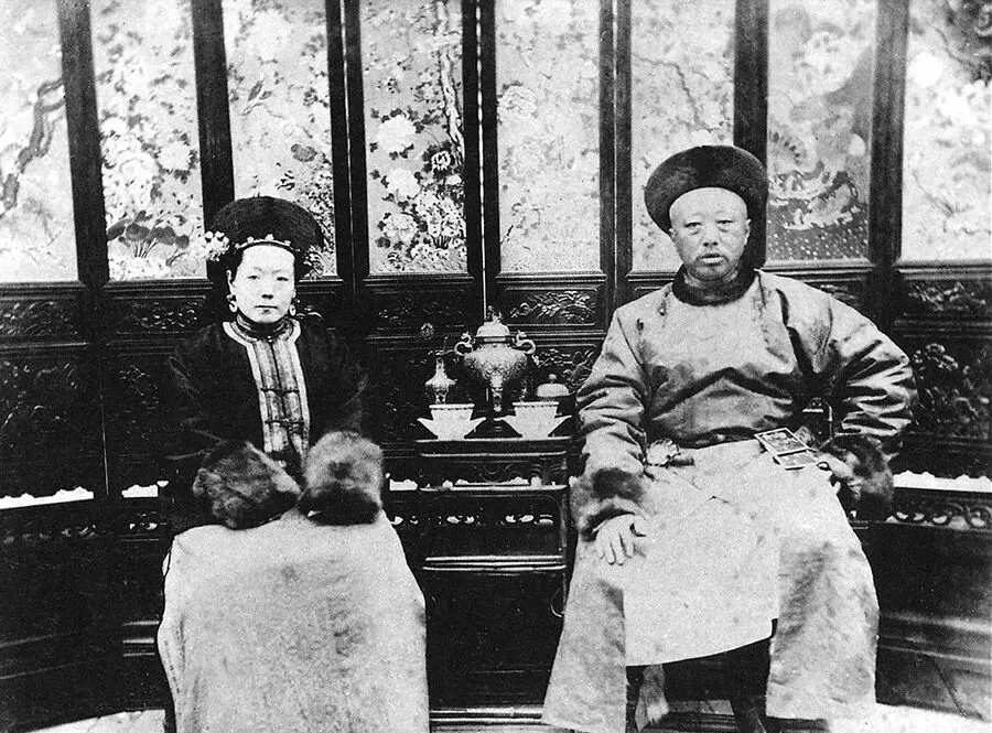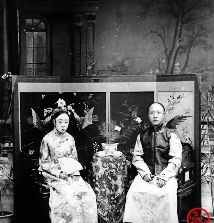 这幅摆在花鸟屏前的是载沣和幼兰,幼兰手里团扇半掩着指节,细细的扇骨像一排牙,载沣的马甲是亮纹缎,扣子从脖下一直坠到腹上,神情像在想事,家里人打趣说他“与王公大臣常相对无言”,倒也不全是笑话,照片里确实能看出一点拘着的闷。