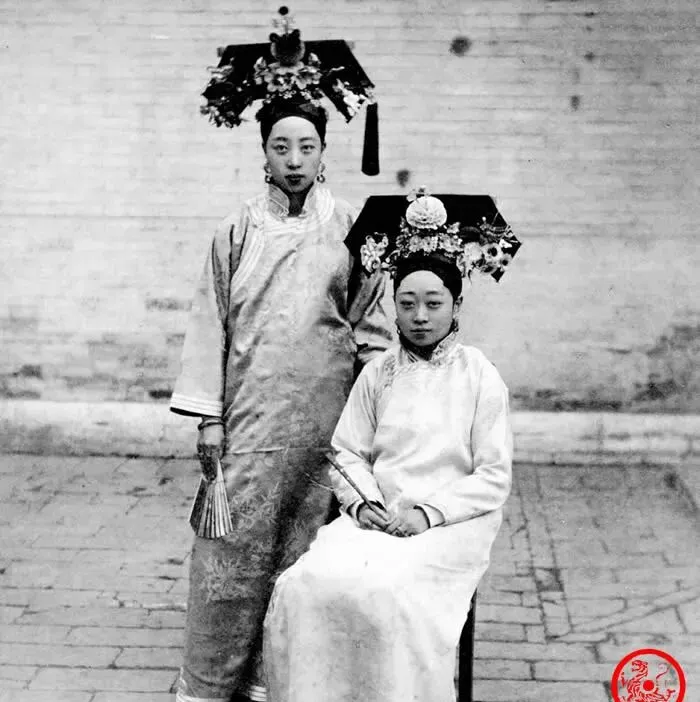 这对年轻姑娘是宗室的女儿,严格说不上格格,站着那位掌中团扇轻轻合起,坐着的把扇面压在膝上,头面花钿层叠,耳坠垂得长,衣料素里带光,砖地铺得平平整整,背景空阔,像是在宫里某个角落临时搭的景,少女脸上不见脂粉堆砌,眼神却有点倔,挺可人。