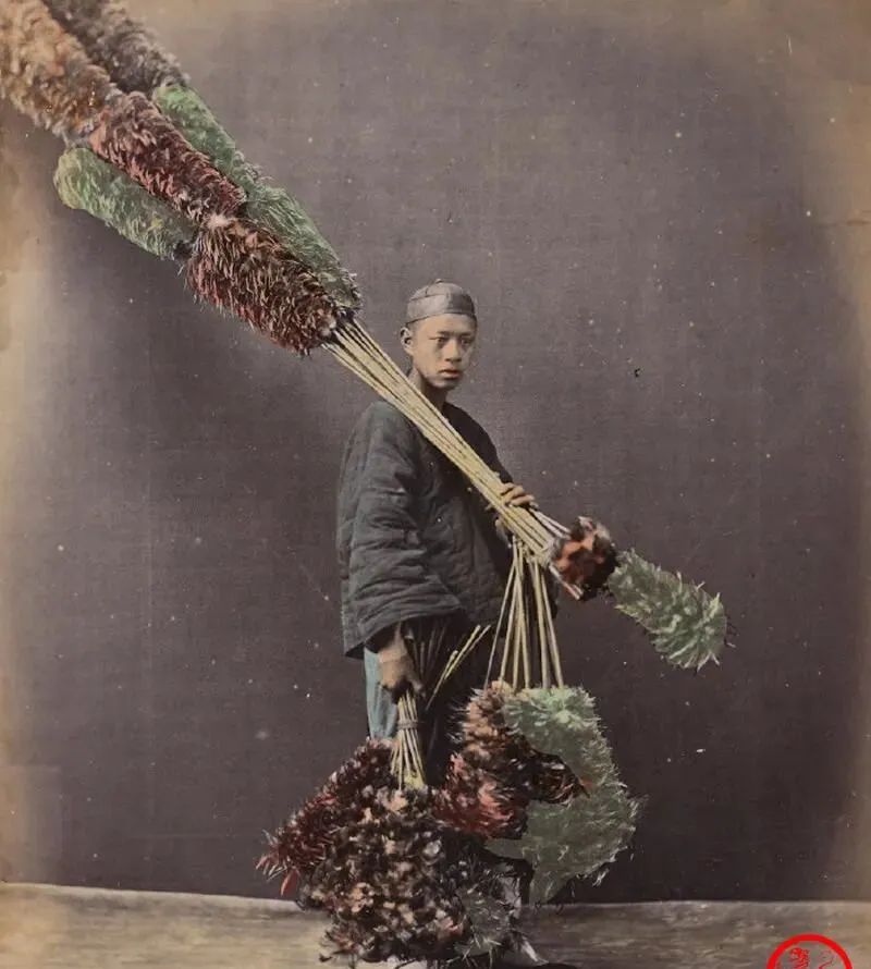 这个扛了一身彩色毛团的叫鸡毛掸子小贩,竹竿穿成一束,红绿相间像一把把小树,走起路来毛穗子抖得利落,我小时候家里柜顶就插一把,打扫时往下轻轻一拨,灰尘飞起来像下毛毛雨,便宜耐用,现在谁还用掸子,吸尘器一开就完事。