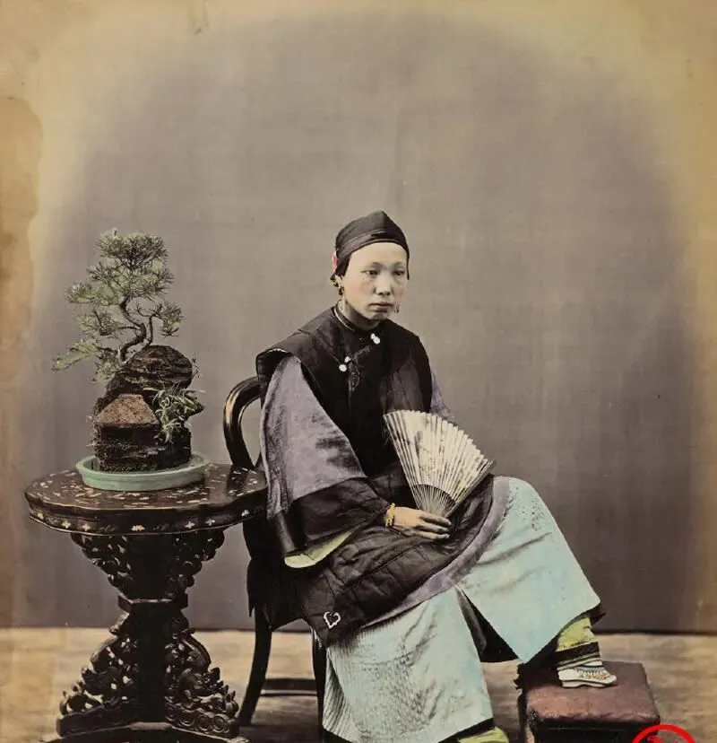 这位坐着团椅的女子,图中这只小脚就叫三寸金莲,特意搁在脚凳上让你看个明白,绣鞋尖尖翘起,鞋面压着细细暗纹,衣襟是黑缎滚边,手里把着折扇,她眼神淡淡的,不爱多说话的样子,妈妈叹口气说这脚走不了几步,出门得人扶着,好看是好看,遭的也是罪。