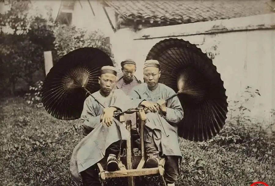 这个三人坐具叫独轮车,两边大伞是遮阳伞,伞面像扇贝壳一样张开,前头两人姿态一模一样,别说了,像极了双生的兄弟,车把细细一根,车夫得拿命去稳它,路上有个坑就可能栽跟头,城里乡下都用过,轻便却考手艺。