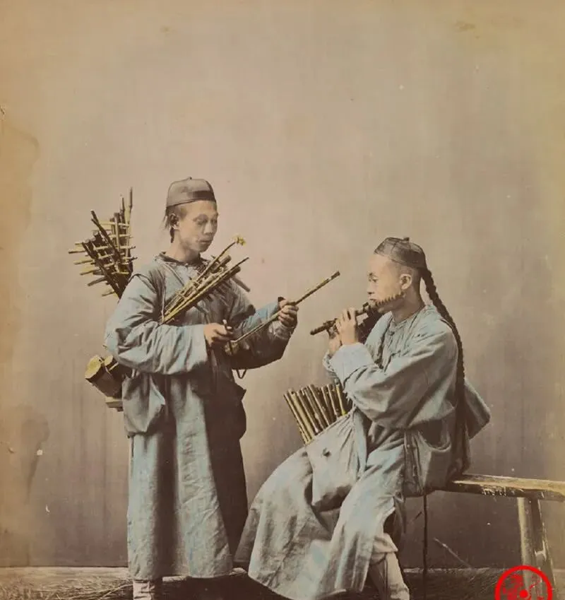 一人坐着,一人站着,手里拿的是管子和笛,嘴边的气息能想象得出来,站着的那位把笙护在臂弯里,像怕磕了一样珍惜,这种合奏,转个调就能从喜事换到小曲,靠的是耳朵熟,不是谱子多。