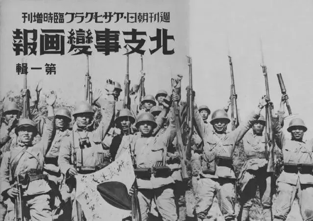 图中这本画报叫《北支事变画报》,黑底大字压在一群举枪的人头顶上,旗子被举得皱巴巴的,纸张的颗粒像沙子一样糙,老一辈说当年这增刊来得急,消息更急,封面就像鼓点,一下一下往心上砸。