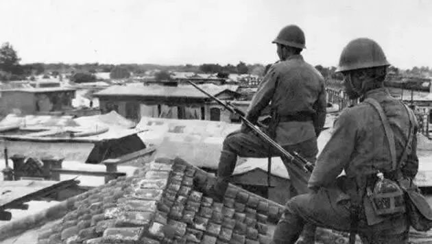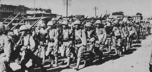这队列就是侵华部队的行进队,泥土路上踏起一溜灰,枪口和刺刀在太阳底下发白,背包鼓鼓囊囊,鞋跟砸在地上像敲鼓,照片里看不见哭声,但每一步都在逼近城门。