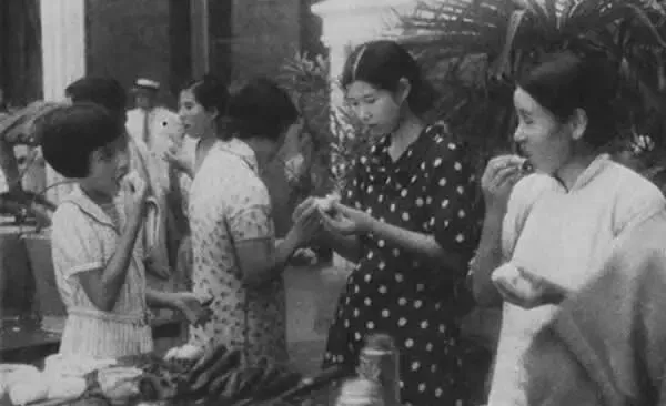 这张看着平静,是战时日本侨民的街头一角,碎花旗袍和短发少女在摊前低声说笑,手里拈着点心,背景里站着警帽的人影,战争有两张脸,一张让人挨饿,一张装作没事,奶奶说那会儿城里也能见到这种热闹,可拐过弯就是岗哨。