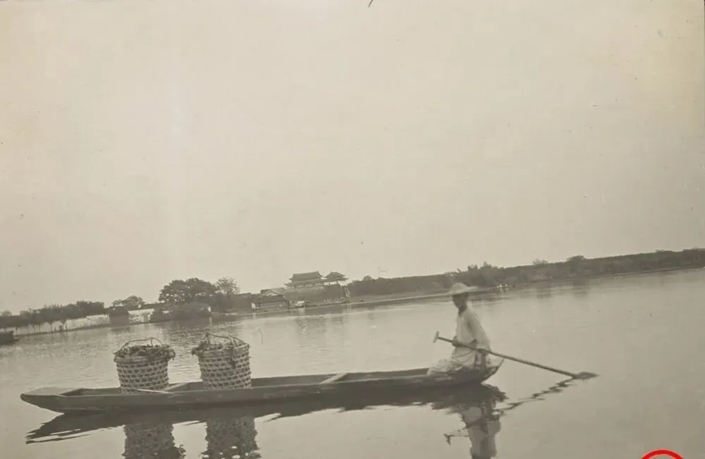 船舱里的这对家伙叫竹篓,粗竹篾直立,圈口被布条勒了一圈,估摸着是运菜或者运鱼的,水面晃一下,篾影也在水里打格子,老板轻轻往前划,怕的是溅水把货给打湿了,这门小心思,隔着百年还能看出来。