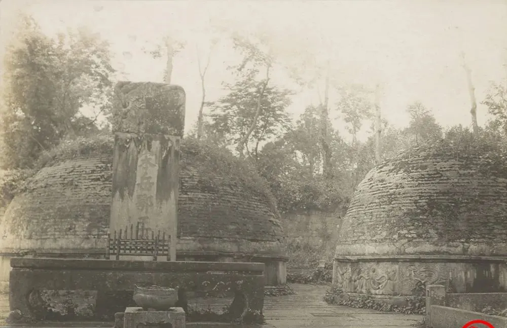 图中两座圆鼓鼓的砖包叫墓冢,表皮起碱起霜,缝里长着细草,石碑身子发黑,碑额还挂着剥落的纹样,爷爷说早年到这里烧纸要先把落叶扫干净,别脏了岳爷爷的门面,现在我们再去看,形制整饬了不少,游人也多了,旧影一对比,味道全变了。