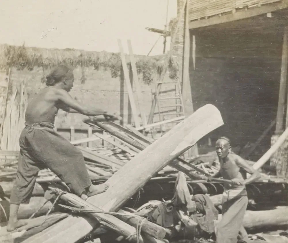 这个活路叫解板,把圆木解成板料,两人一上一下拉大锯,木香子被晒得发甜,脚下锯屑厚到一脚能陷半寸,师傅腰上系条旧布带,汗顺着肋骨往下淌,没穿上衣是常事,可见火力大,过去造屋靠这口手劲,现在全是锯台机子轰隆隆,一上午能出一院子的板,时代换挡就是这么快。