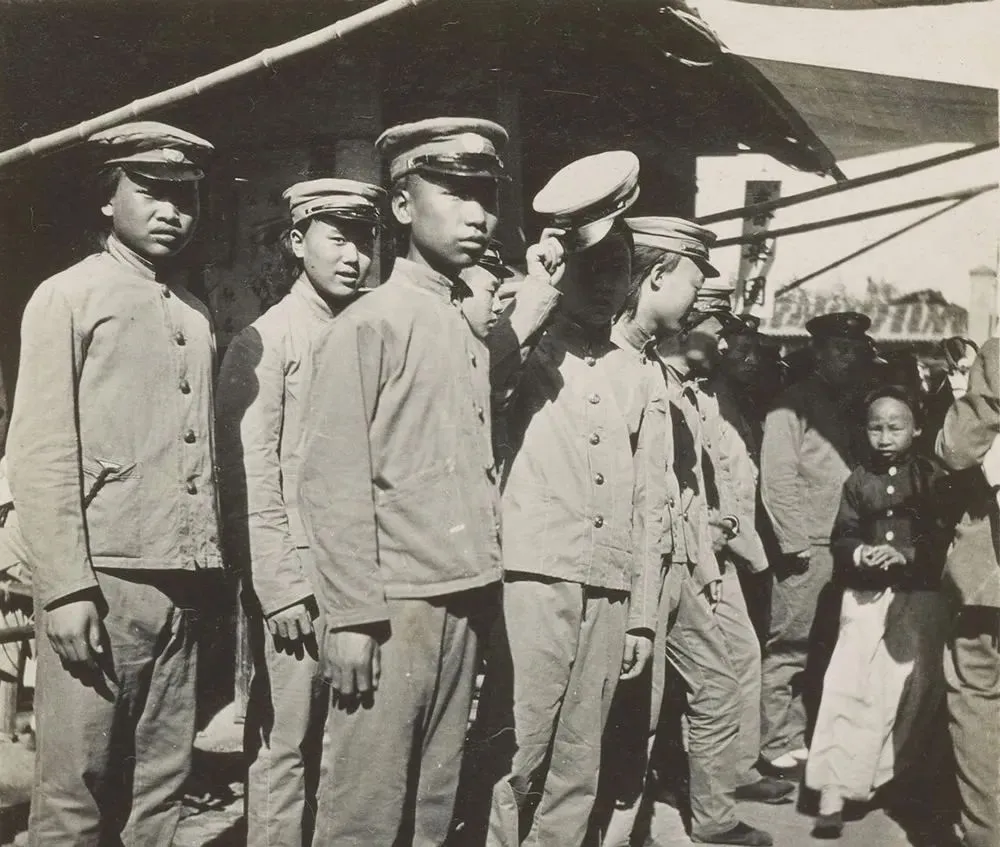 这群穿灰布制服的小伙子叫新军学兵,帽檐压得低低的,扣子扣到最上面,排在街角晒太阳,眼神里还带几分好奇,老师傅站在一边看热闹,说站如松还差点火候,要把脚后跟并上去,肩放松,肚子收起来,后来我们看阅兵,才晓得什么叫一条线走到底,那股气势,和这张照片里的青涩正好对照。