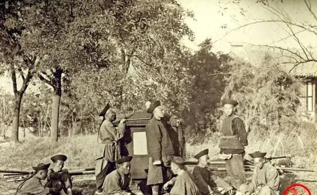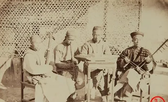 图中这几位叫街头乐师,二胡、月琴、笙管一摆,桌上搁着个小扬琴,穿着长袍马褂坐小木椅,身后是编织的篾隔扇,阳光一打全是颗粒的影子,声音想都能想出来,先是试弦的哼声,再是一段《四合如意》的慢板,边上有人点曲儿就往前凑一个钱袋子,收钱不吵不闹,全凭手艺吃饭。