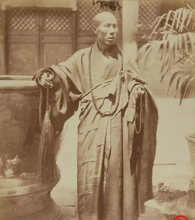 图中这位叫当值维那,肩上披搭僧衣,胸前绕着粗大的念珠,手里拿拂尘,站在铜缸旁边,神情却不在镜头里,像是正想着晚课的偈子怎么起头,外头树影晃一晃,庙门里的钟声一串串接住了日头。