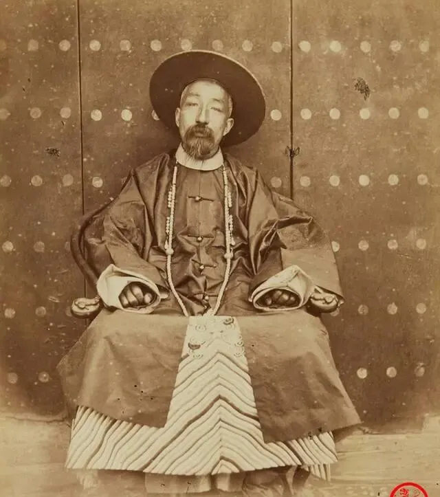 椅子上这位叫朝服大臣,胸前挂着朝珠一串串,帽顶花翎分明,圆钮扣子在衣襟上排得老老实实,手心里托着暖手的团炉,看着有点困,又像刚从堂上退下,外头鼓声一停,他这会儿只想闭目养神两刻。