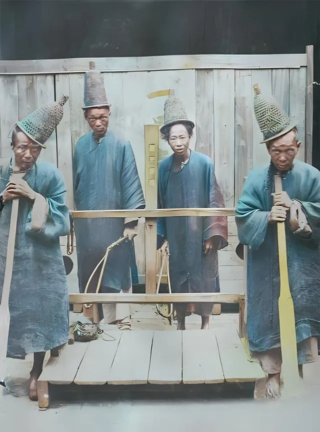图中这帮穿青布长衫的,是县衙里跑堂的差役,手里的宽板叫夹棍,细长的藤条是板子,木色发黄,边角磨得发亮,帽子像竹编笠篓,往上一扣就算制服了,站在木栏前,样子谈不上威风,更多是一股子干活人的疲惫气。