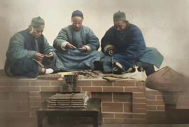 这个场景最熟,图里砖砌大炕热乎着,三位老财坐成一排,面前摆的是成串的制钱,穿绳的细活儿要耐心,用的是细牛皮绳或麻绳,边上一个算盘立着,枣木框子,珠子油亮,拨起来清脆得很。
