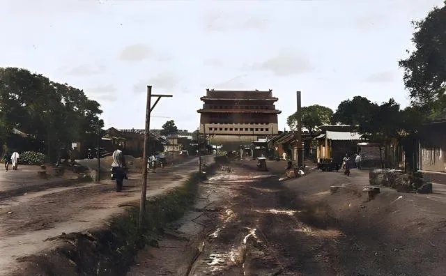 这条道是京里通西山的要路,图上右边沟渠一道,雨水冲出槽来,路面坑洼,车辙一条压着一条,远处那扇门楼气派着呢,红墙灰瓦沉着不动,近处摊贩小屋挤在边上,烟火味与皇家气并排站着,倒也不别扭。