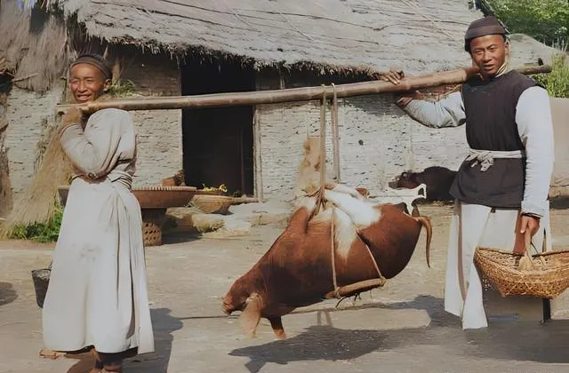 这个架子叫扁担,横木结实,肩窝压出老茧才扛得稳,猪腿扎绳倒挂着,白肚皮朝阳一晃一晃,男人在前头叫卖,女人跟着提篮子,笑得见牙不见眼,估计是盼了一个秋天,猪膘肥了,总算能换回油盐柴米。