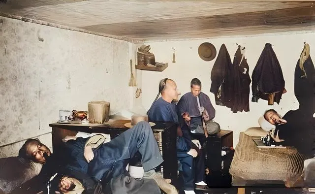 这个屋里光线昏黄,炕几上摆着小铜炉,细嘴的烟灯搁在边上,褥子压得塌陷,人或躺或坐,眼神散着,墙角挂衣摇摇欲坠,桌面茶碗里早凉了,窗缝透进一点风,也提不起精神来。