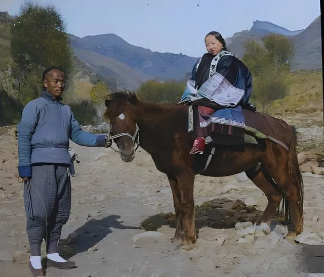 看缰绳的结,先一个活扣,再绕两圈压实,不滑手,女人脚下那双三寸金莲的鞋,绣面精致,底薄得可怜,骑在鞍上也要端着身段,男人不说话,手在马鼻子边轻轻抚着,意思是别惊,路还长着呢。
