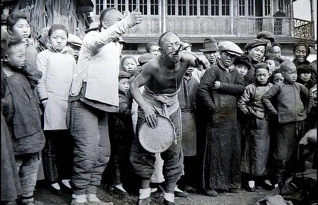 图里这面小铜锣叫锣盘,靠边站着吹哨的伙计一敲锣一吼嗓子,人群就围上来了,锣面被手汗磨得发亮,带着一点旧油的味儿,小时候外婆说,听见这种脆响就知道前面有把式在耍火或者变戏法,穷街巷里,乐子就是这么滚出来的。